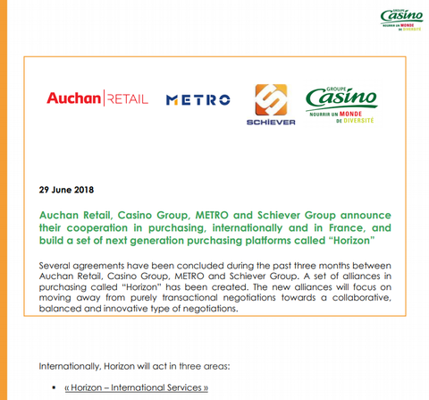 Auchan、Casino、Metro、Schiever、共同購買へ 経営戦略/管理 2018.07.03 フランスのAuchanとCasinoとSchiever、ドイツのMetroは、協働組織「Horizon」を結成し、商品調達などを共同で行う。 具体的には、・国際事業での協力: エキスパート人材の連携・ベーシックなPB商品の共通化・NB商品の共同仕入れ(中小サプライヤーを除く)・間接財の共同購入 などです。 プレスリリースはこちらです。