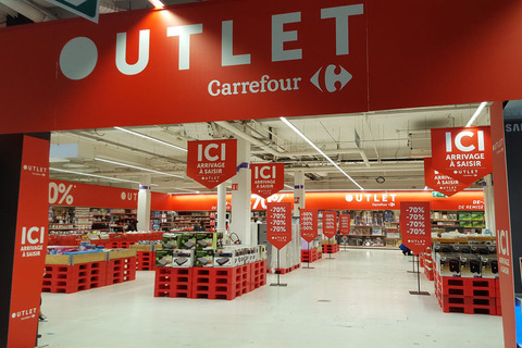 Carrefour、ハイパーマーケット内にディスカウトゾーンを設置 店舗 2018.10.03 Carrefourは、フランス国内のハイパーマーケット業態の店舗にて、ディスカウント売場の設置を拡大している。 「Outlet」と呼ぶこの売場は、500~1,000㎡程度の広さで、見切り品や長期在庫品などを通常よりも30~70%安い価格で販売している。 現時点では、7店舗に設置済みで、2018年末までにさらに12店舗に設置する予定。