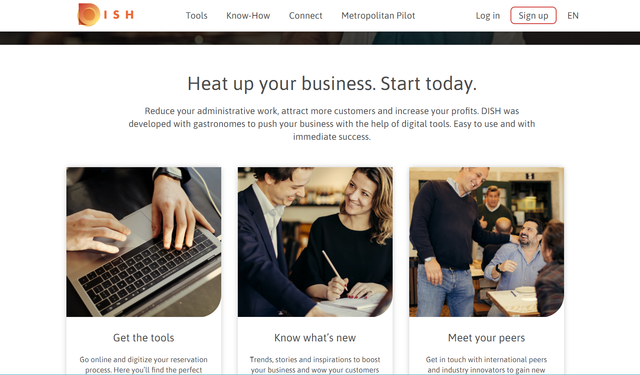 「DISH」はDigital Innovation and Solution for Hospitality(直訳:おもてなしのためのデジタルによるイノベーションとソリューション)を意味しており、飲食業をさらに効率的に営むための各種ツールや、メンバー間の情報交換や交流を促進するコミュニティー、業界での最新情報の提供メディアなどが用意されている。ツールには、顧客向けのオンライン予約の仕組みを作れるツールや、メニューごとの収益計算をするツール等がある。