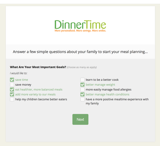 DinnerTimeは、会員があらかじめ登録した嗜好(時間的制約、予算、健康意識、アレルギー、ダイエット等)に基づき、食事のメニューを提案し、そのレシピ及びそれを作るための買い物リストを作ってくれる。