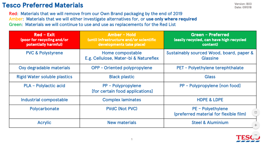 Tescoは、包装材を3つのランクに分けており、赤=リサイクル不可/困難、黄色=リサイクル設備/インフラの完成を待つ、緑=リサイクルが用意として、それぞれ素材を明示している。