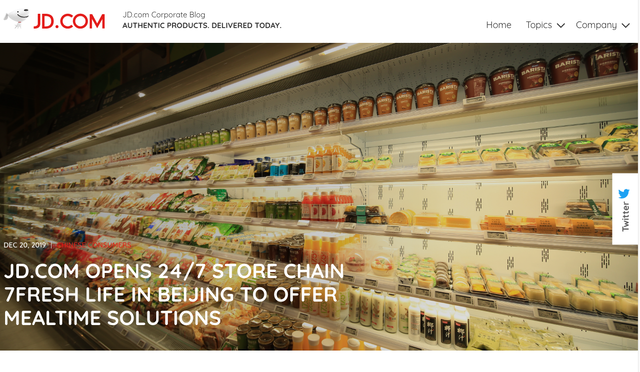 JD.comの7Fresh、小型フォーマットを出店 店舗 2019.12.25 中国のJD.comの食品スーパーマーケット7Freshは、新しい小型フォーマット7Fresh Lifeを北京に12月20日にオープンした。出典:JD.com社のWebサイト この店舗は24時間営業で無休のコミュニティレストラン+生鮮食品スーパーマーケット+コンビニエンスストアを組み合わせたもので、売場面積は400平米で取扱商品は3000以上。半径1.5kmに店舗で調理した出来立ての食材を含め、配送。