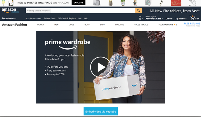 Amazonは、アメリカで洋服を試着した上で、気に入ったものだけを購入し、残りを返品できるサービス、Amazon Prime WardrobeをPrime会員向けに開始する。