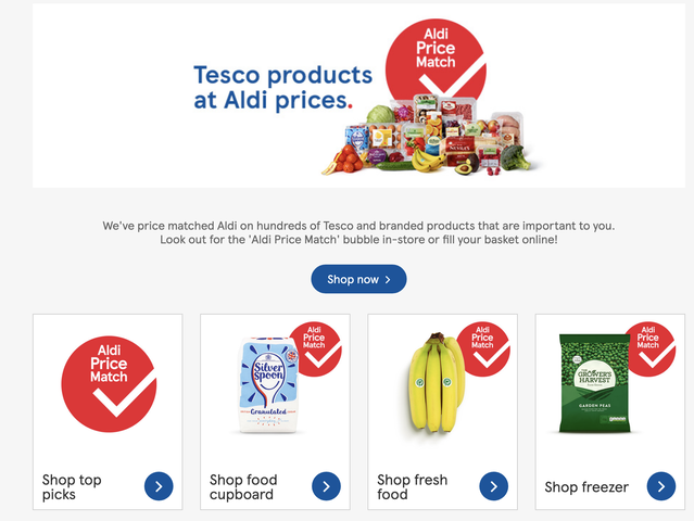 イギリスのTescoは、ドイツ生まれのハードディスカウンターAldiとの競争に勝つために、数百の商品の価格をAldiに合わせるキャンペーン、Aldi Price Matchを開始した。