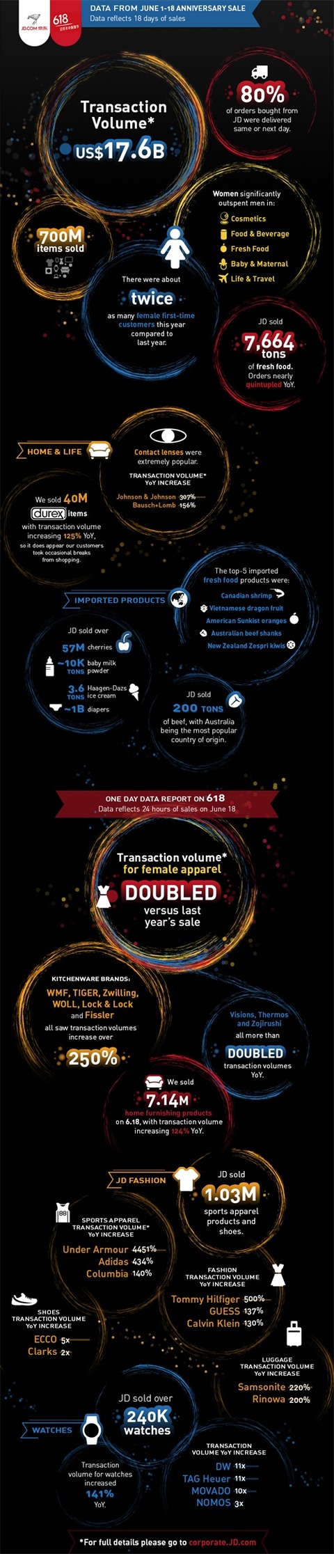 客数は昨年と比較して50%増であり、この販促は中国にて、11月11日の「独身の日」と並んで大きな販促イベントに成長している、とJD.comはコメントしています。
