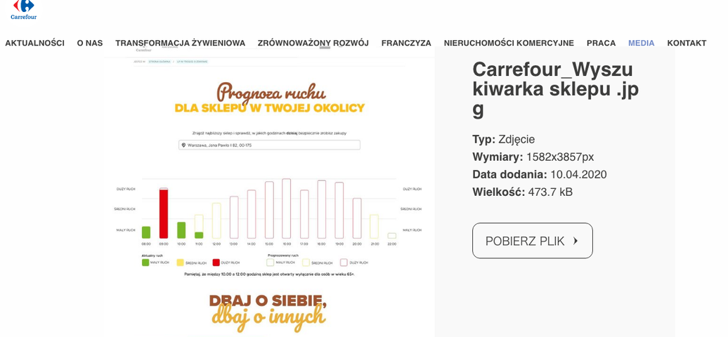 Carrefour、来店客数予測をWebサイトで公開 テクノロジー 2020.04.13 フランスのCarrefourは、ポーランドにて、店別の時間帯別来店客予測をWebサイトで公開を始めた。 出典:Carrefour Poland社のWebサイト この予測値はポーランドのテクノロジー企業SyneriseとK2Preciseと共同で開発された。各店舗のリアルタイムの来店客数と過去の来店客数履歴から予測をしている。