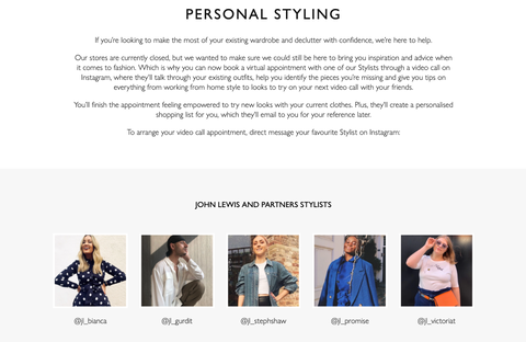 John Lewis、Intstagramを使った顧客向けコンサルテーションサービスを開始 オンラインリテール 2020.04.14 イギリスの百貨店John Lewisは、Instagramを使った顧客向けコンサルテーションサービスを開始した。これは顧客がInstagramにてJohn Lewisのスタイリストとの相談を予約し、ビデオコールを使って服装やコーディネートのアドバイスを受けるというもの。 出典:John Lewis社のWebサイト ワードローブのリフレッシュ、仕事着、休暇の服装、特別な日の装い、デニムと合わせる、などのテーマがあり、それぞれ1時間〜2時間枠で相談料は無料。