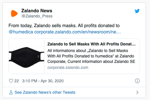 Zalando、非医療マスクを販売し、その収益を医療支援団体に寄付 CSR 2020.05.05 ドイツのファッションオンラインリテーラーZalandoは、1ユーロから買える医療用ではないマスクを販売し、これによる収益を医療支援団体Humedicaに寄付をする。 医療用ではないマスクを販売することには、批判も寄せられている。