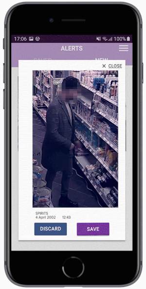 AIカメラが盗難を検知すると、盗難したシーン4秒間の動画を即座に警備スタッフに転送をする。