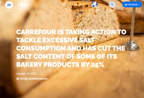 フランスのCarrefourは、店内のベーカリーで作っている商品の一部から、塩分を25%削減する。発表によれば、風味を損なわないために塩を、カルシウムとカリウムが豊富な海水精製塩に変更した。