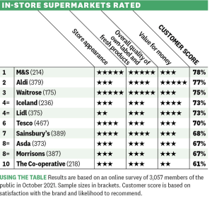 消費者団体Which?が、消費者にイギリスの大手スーパーマーケット10社を、店舗の雰囲気、PB商品と生鮮食品の品質、価格、混雑具合等で評価。