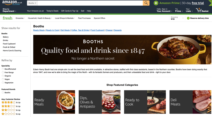 Amazonはイギリスにて、イングランド北西部の食品SMのBoothsの商品を、AmazonFreshにて取扱を始めた。