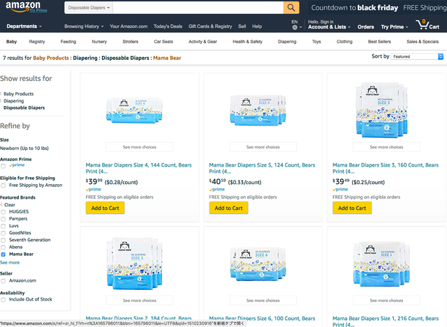 Amazon、PBでオムツを追加 商品/サービス 2017.11.10 Amazonは、PB商品として乳幼児用オムツを「Mama Bear」ブランドに加えた。 Amazonは以前にもPBのオムツを販売していたが、売行きが好ましくなく2015年1月に販売を中止した。 現在は導入直後のため、購入希望者はAmazonのサイトから購入への招待状を受け取った上で、購入ができる。 このような面倒なプロセスにも関わらず、先週はMama Bearブランドの中でオムツの売上が38%を占めた。この調子が続く場合、NBメーカーにとっては脅威となり得るだろう。