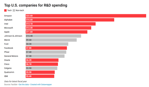 Amazonは、アメリカ企業の中で2017年度の研究開発費支出が、226億ドル(約2兆4,230億円)でNo.1となった。2016年度も同様に1位だったが、それよりも41%増加している。(Amazonの自社用のプログラム開発費用は含まれていない)