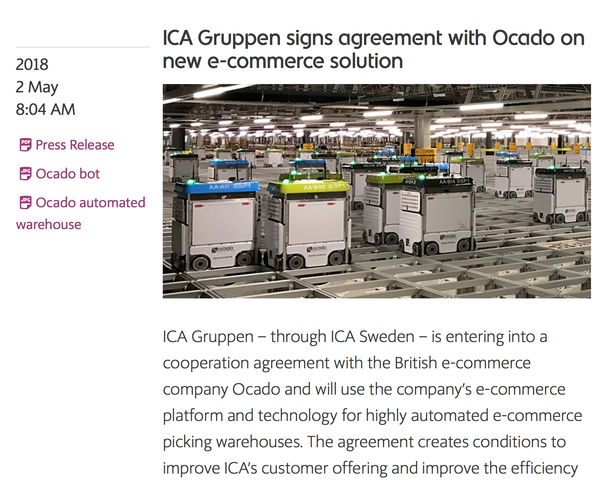 イギリスのオンライン専業食品スーパーマーケットOcadoは、スウェーデンのICA Gruppenにオンライン・リテール用のサプライチェーン・プラットフォームを提供することを発表した。2020年の稼働を計画している。