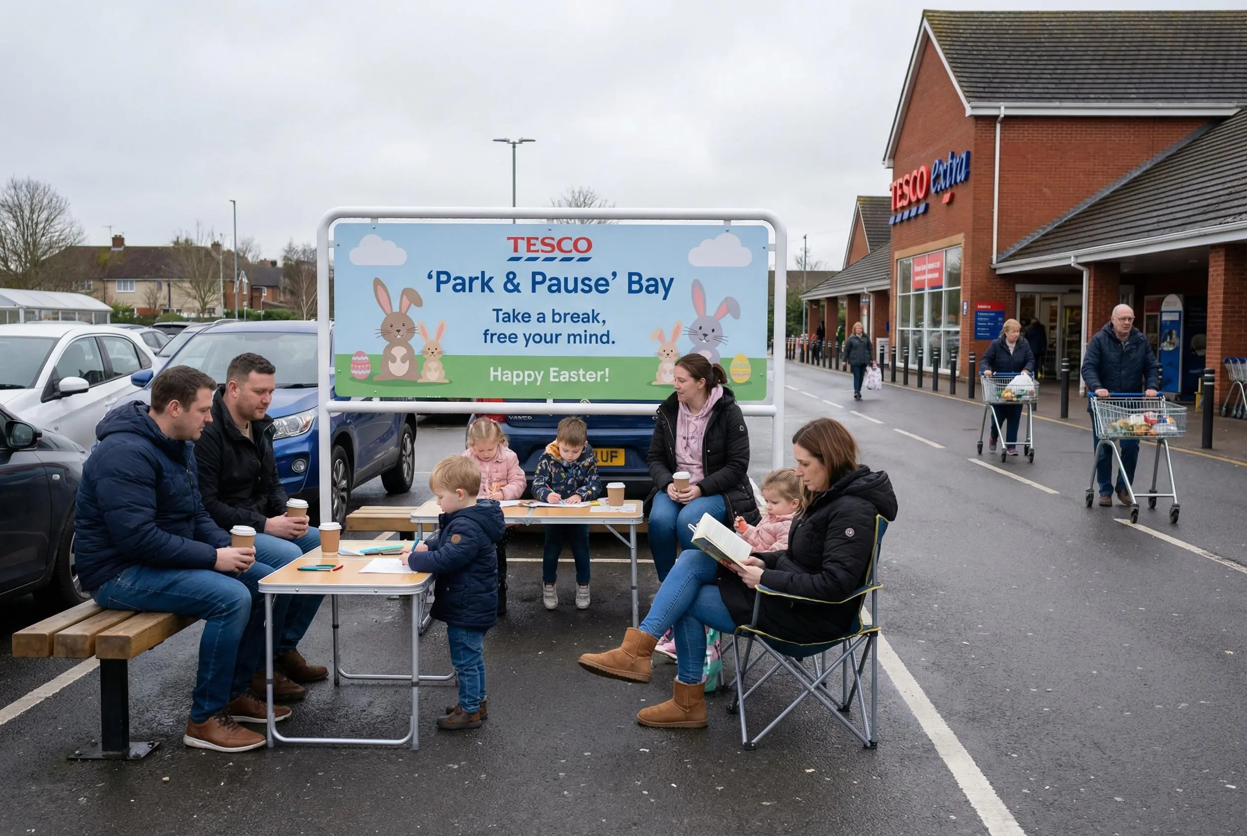 Tescoは、イースター休暇中の混雑や育児のストレスを抱える顧客向けに、期間限定の休憩スペース「Park & Pause」を一部の店舗駐車場に設置する。